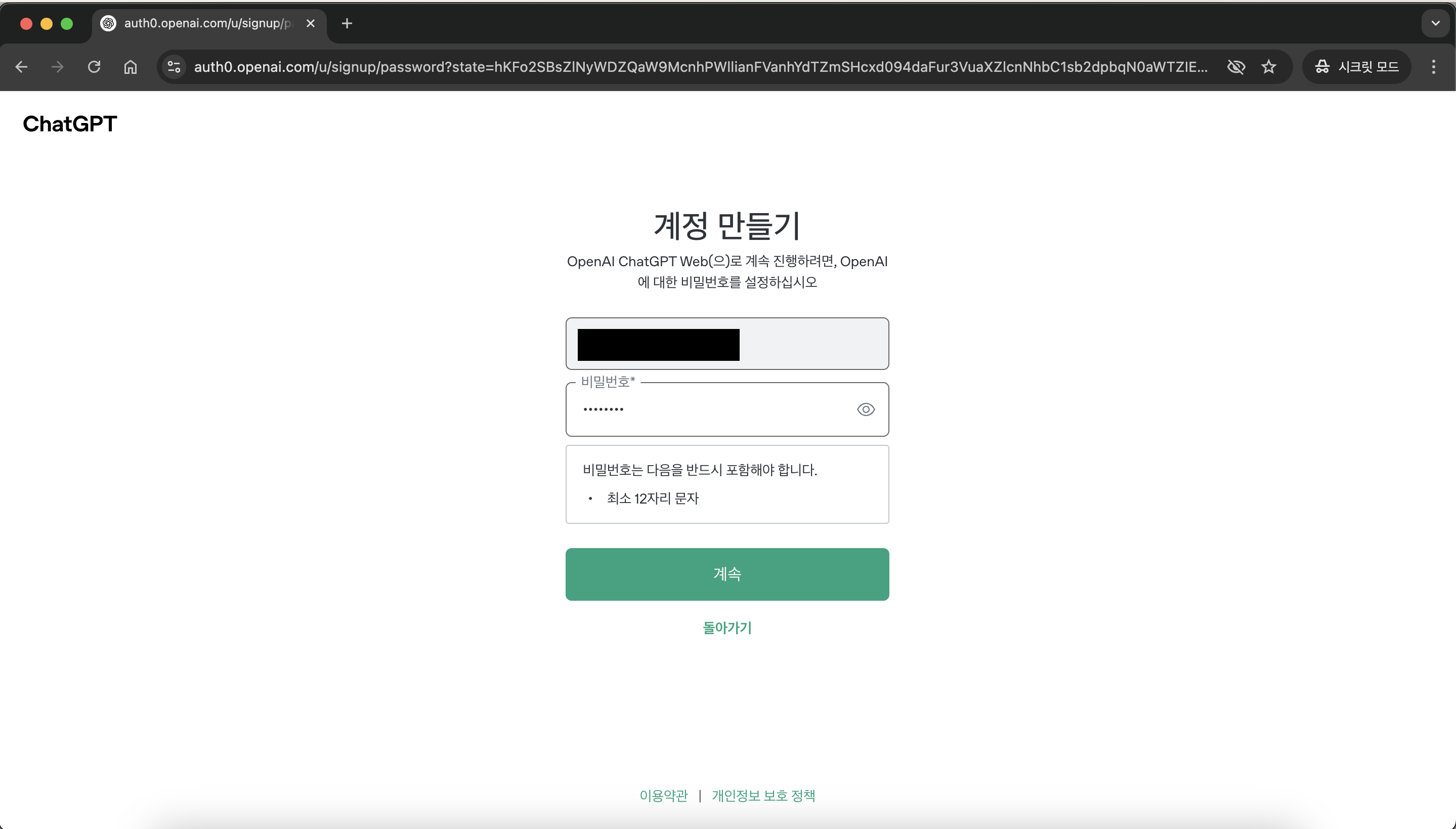 (비밀번호 조건은 최소 12자리 문자여야한다)