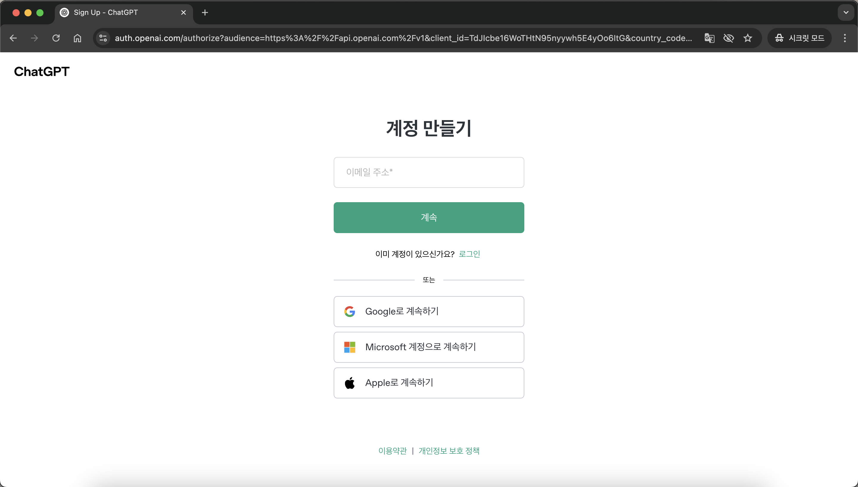 chat gpt는 openAI 사이트를 이용하여 접속이 가능하다.