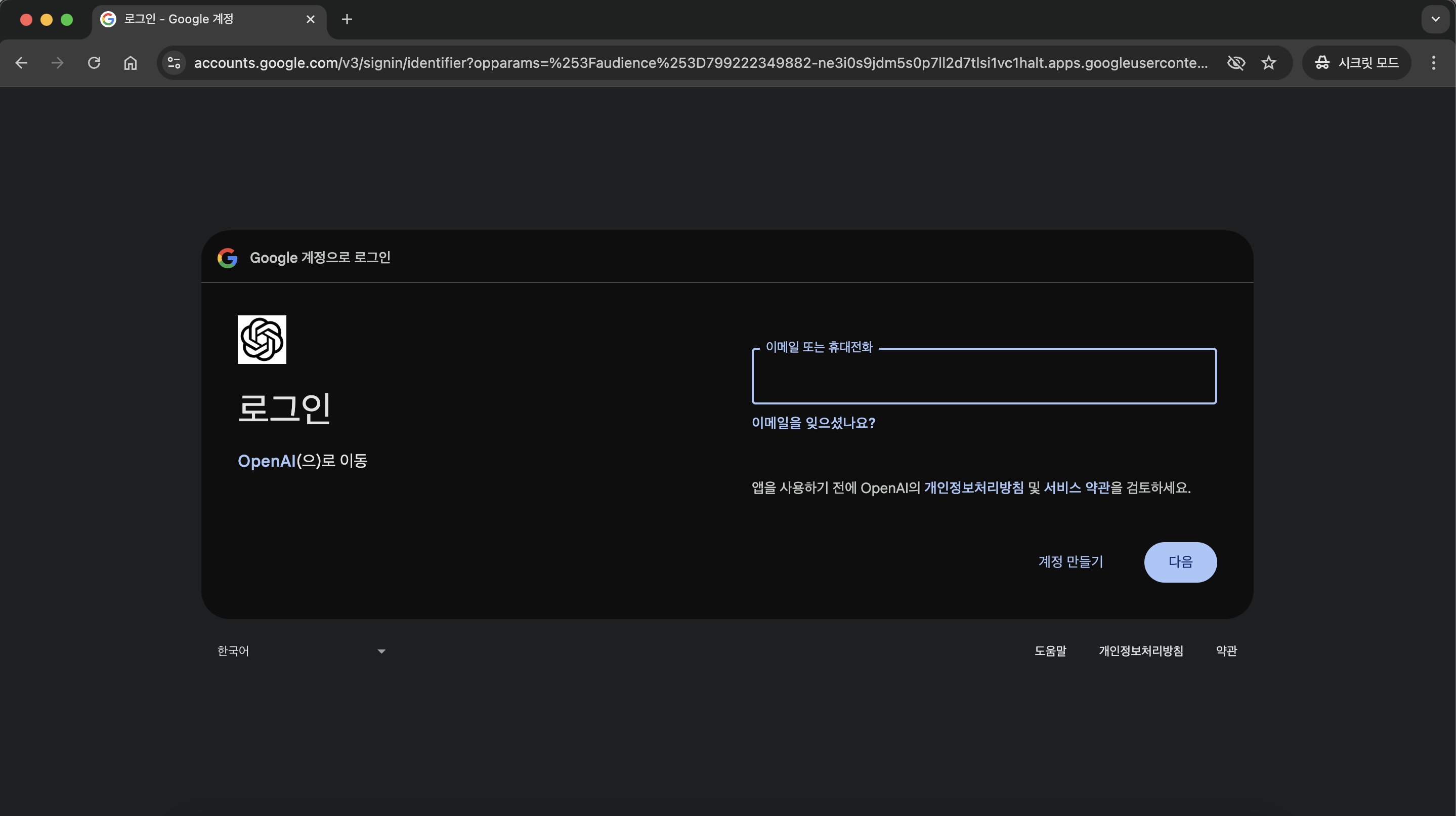 로그인 버튼을 클릭했을 때 위와 같은 화면에서 google로 계속하기를 클릭한다