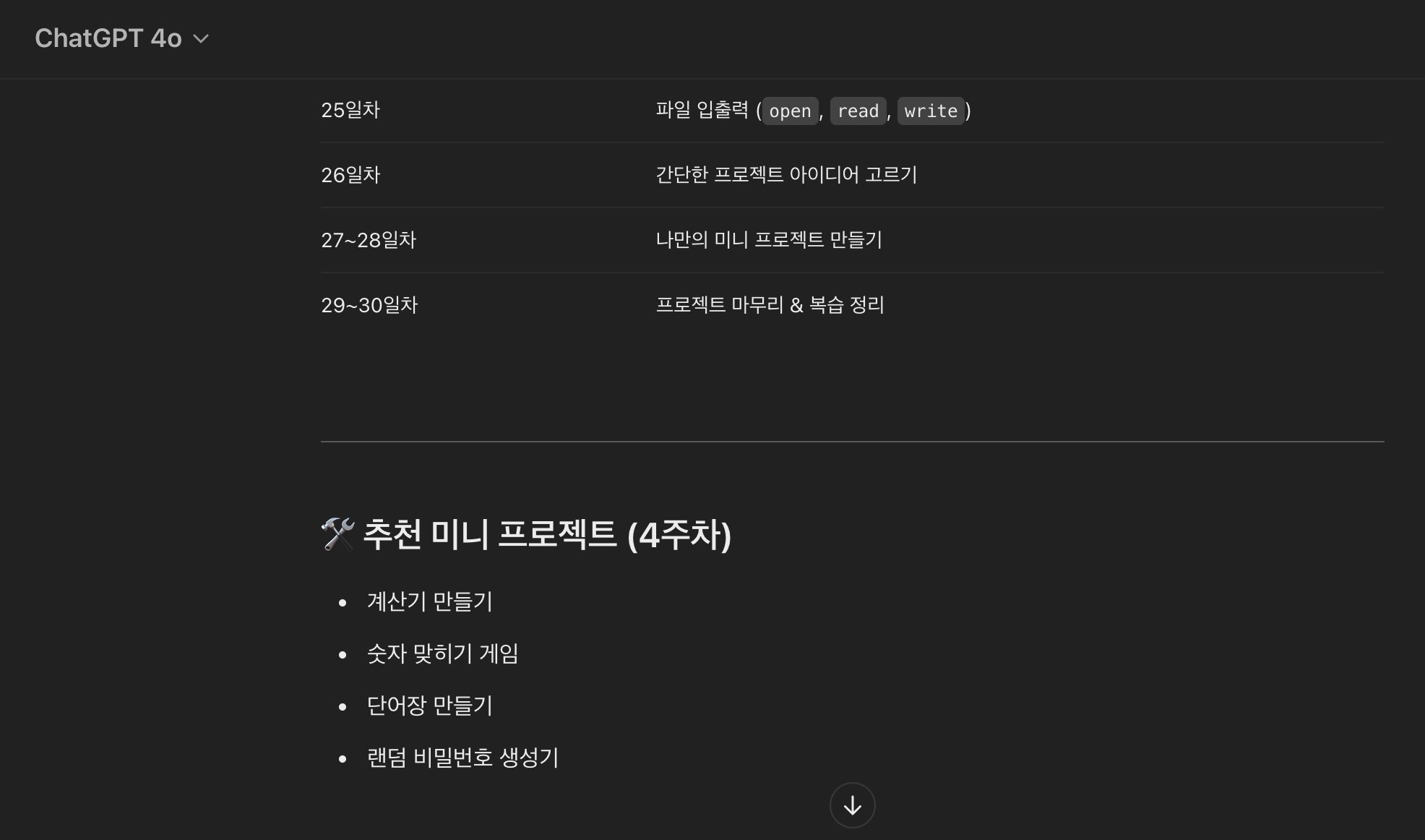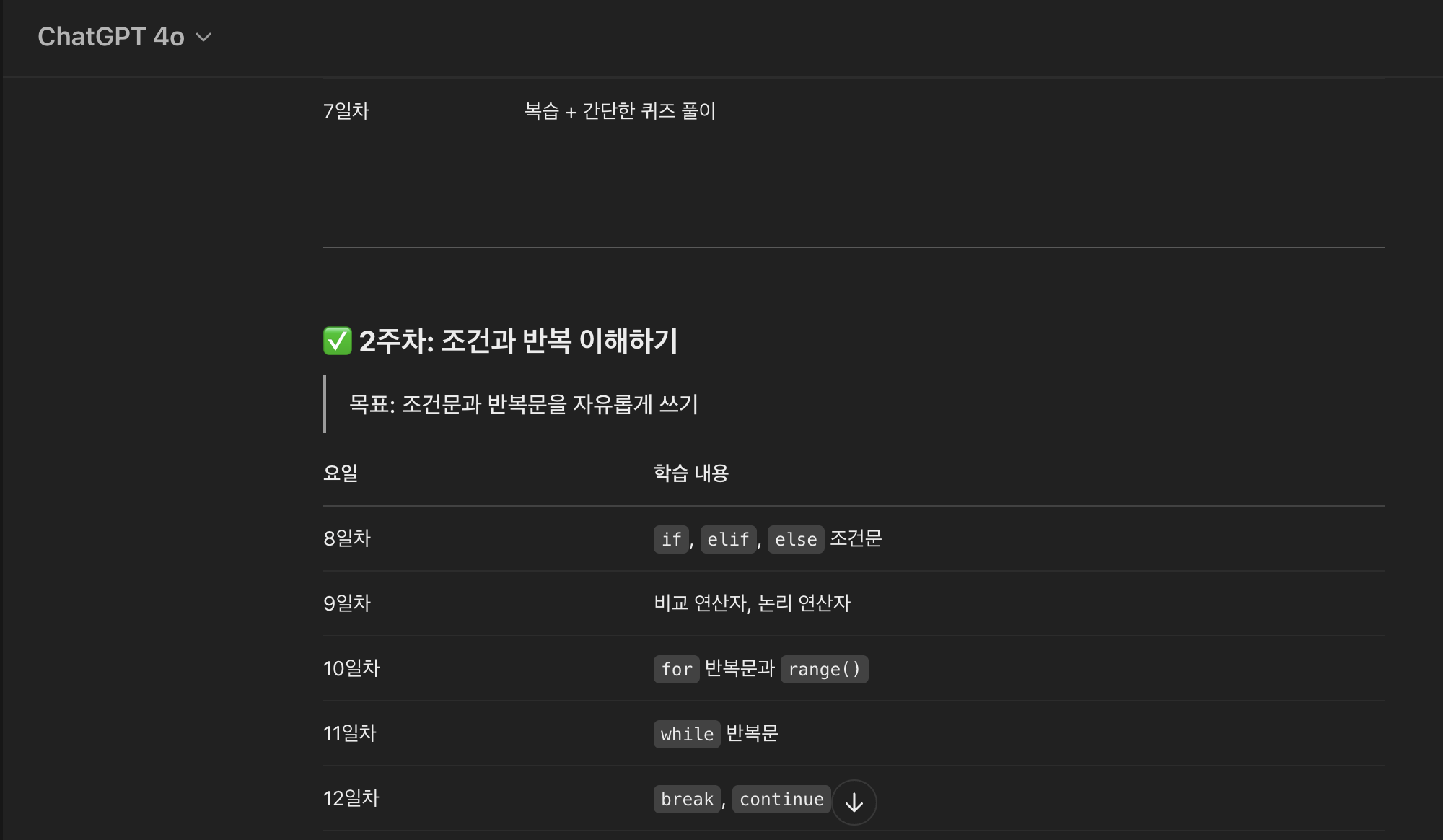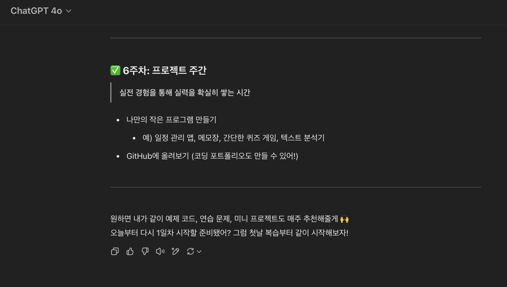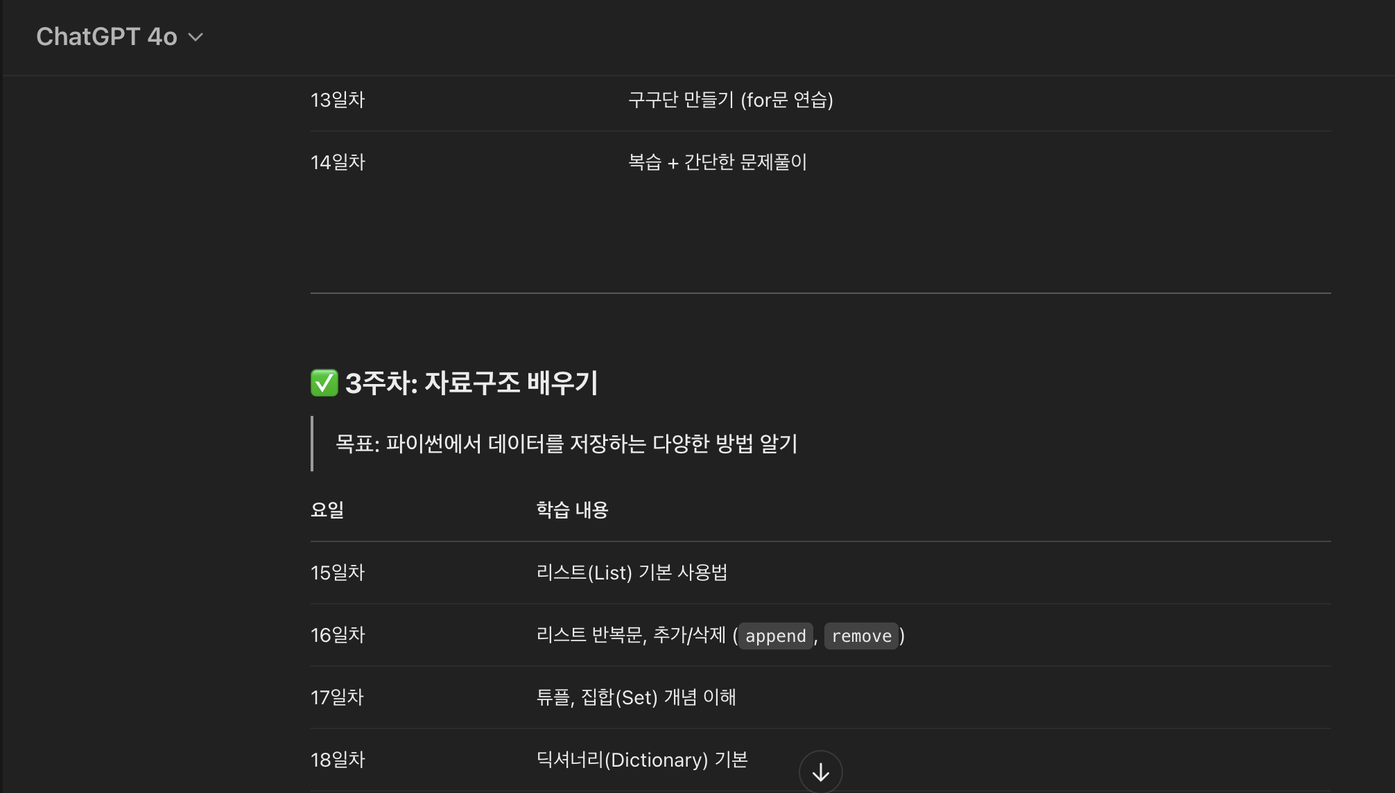 다만, 여태 공부순서를 계획해달라고 질문했을땐 주차별로 계획표를 작성해주었는데 여기는 순서로 나타내었다