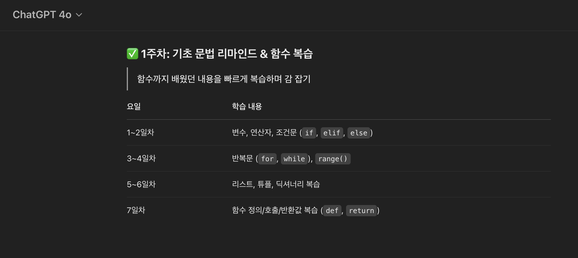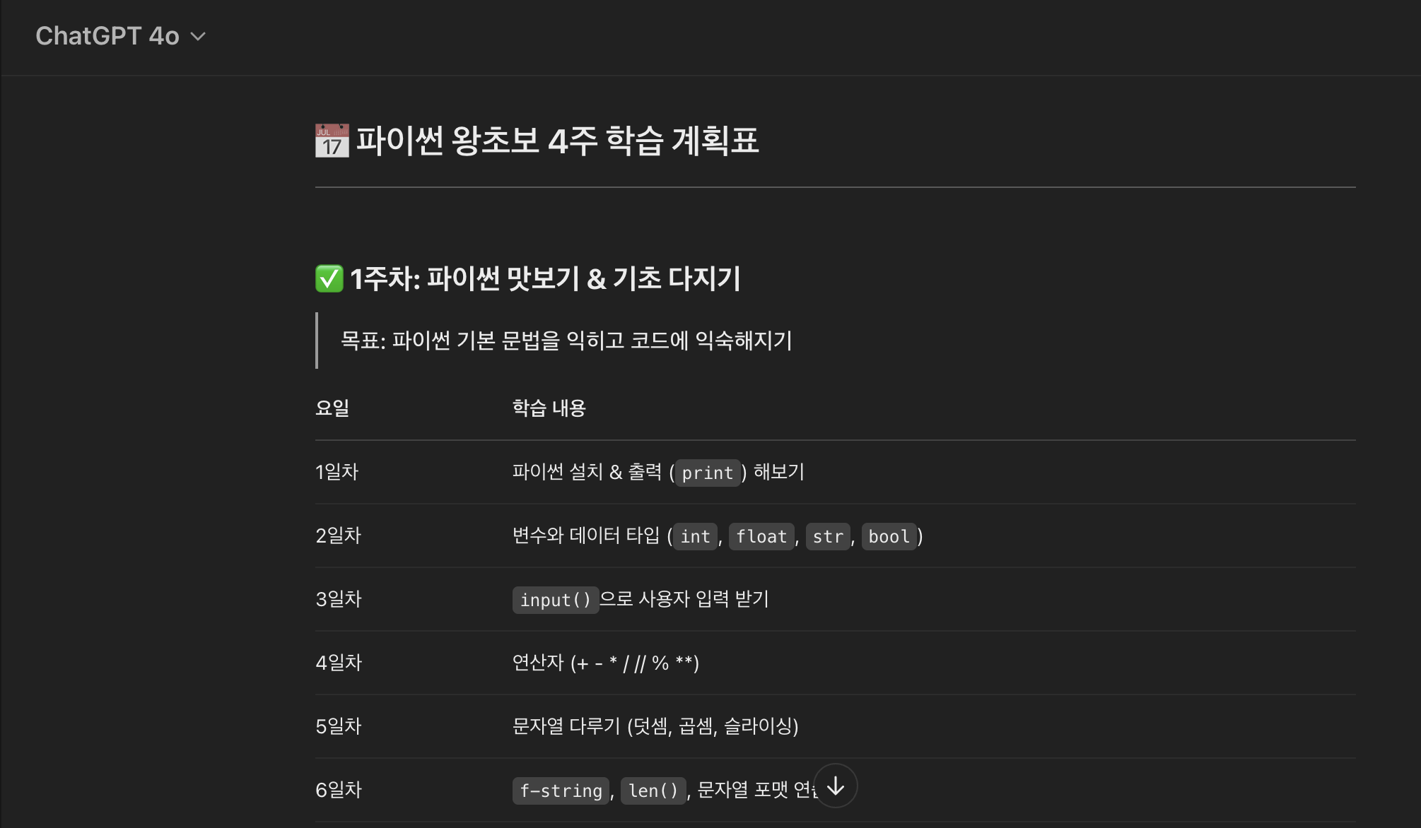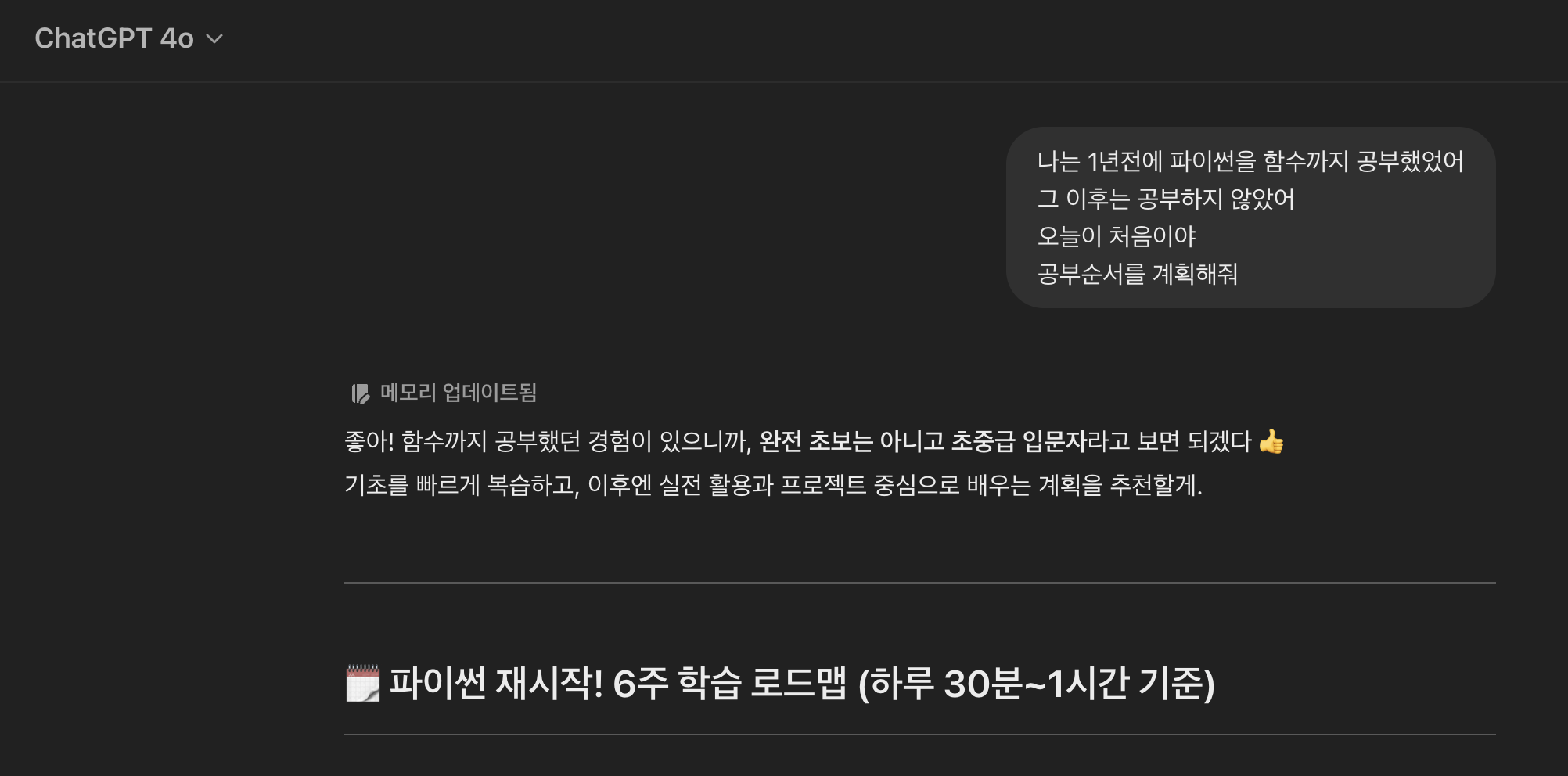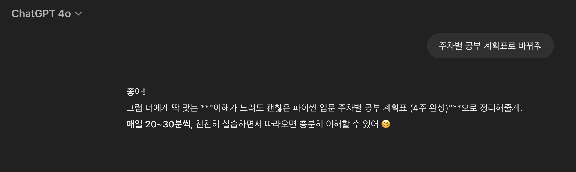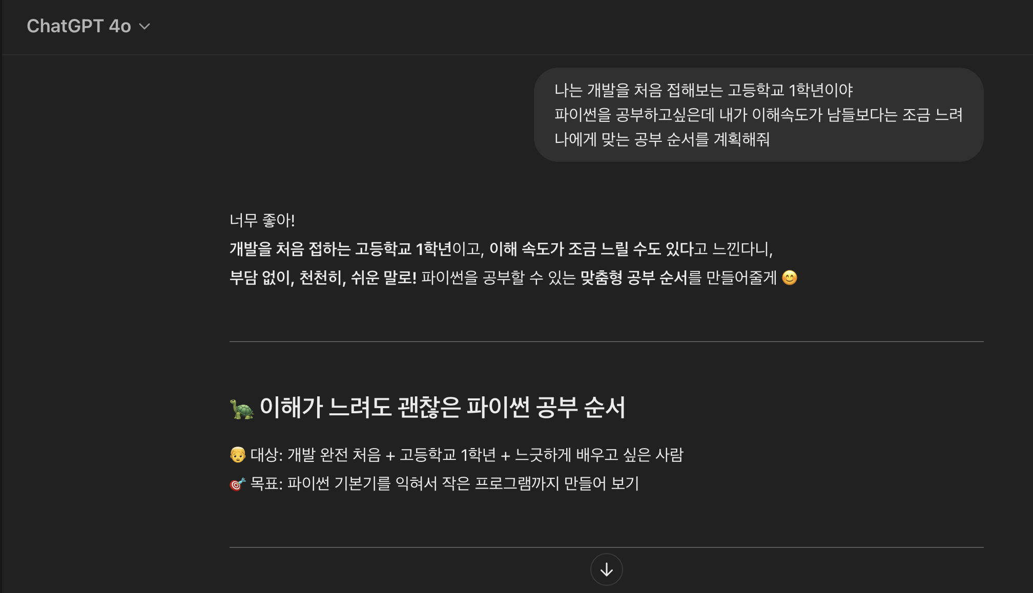 내가 개발자로서 파이썬을 처음 접하는 것인지, 개발을 처음 접하는 것인지부터 이해도와 나의 공부스타일을 제시해준다면