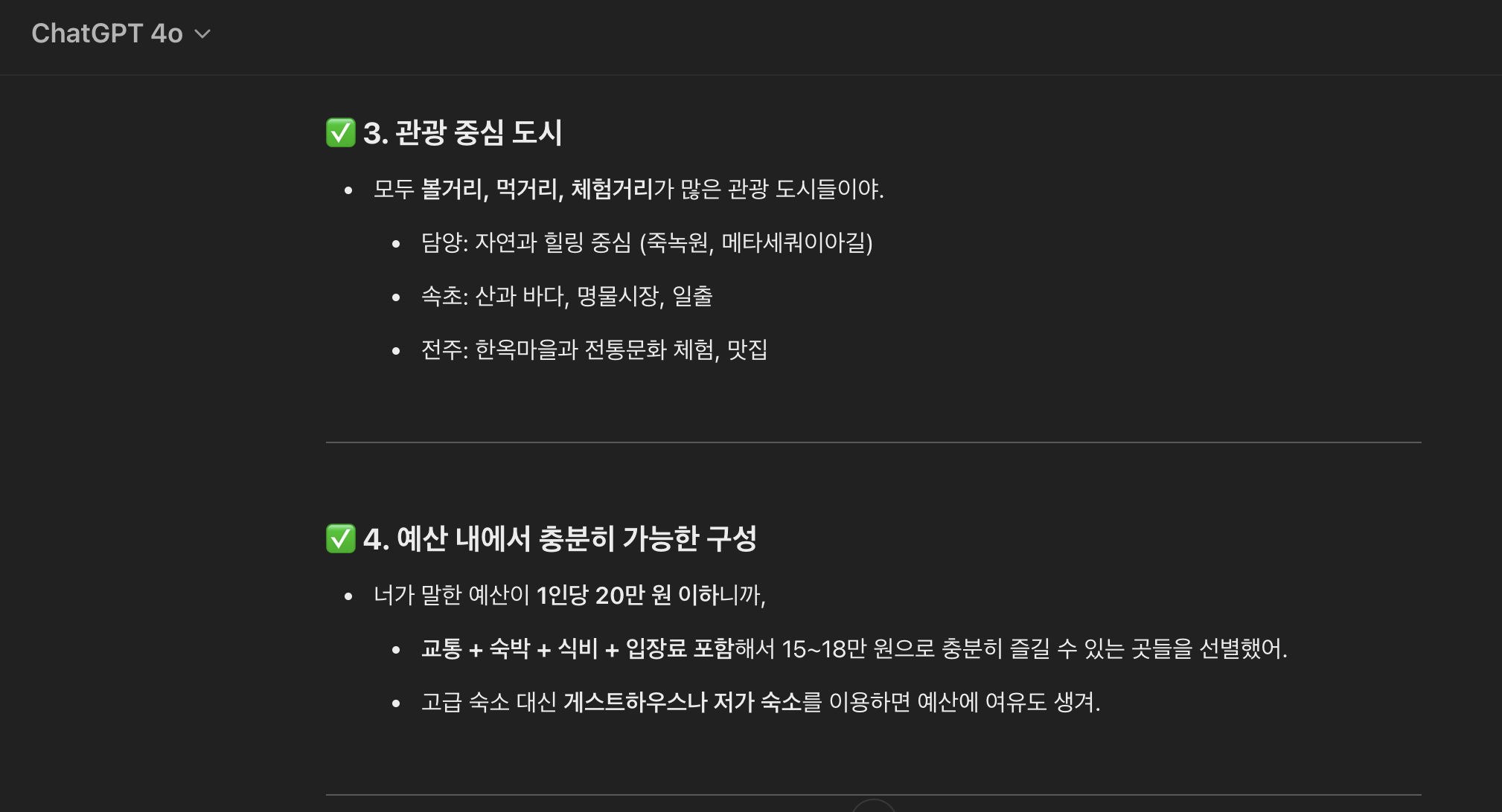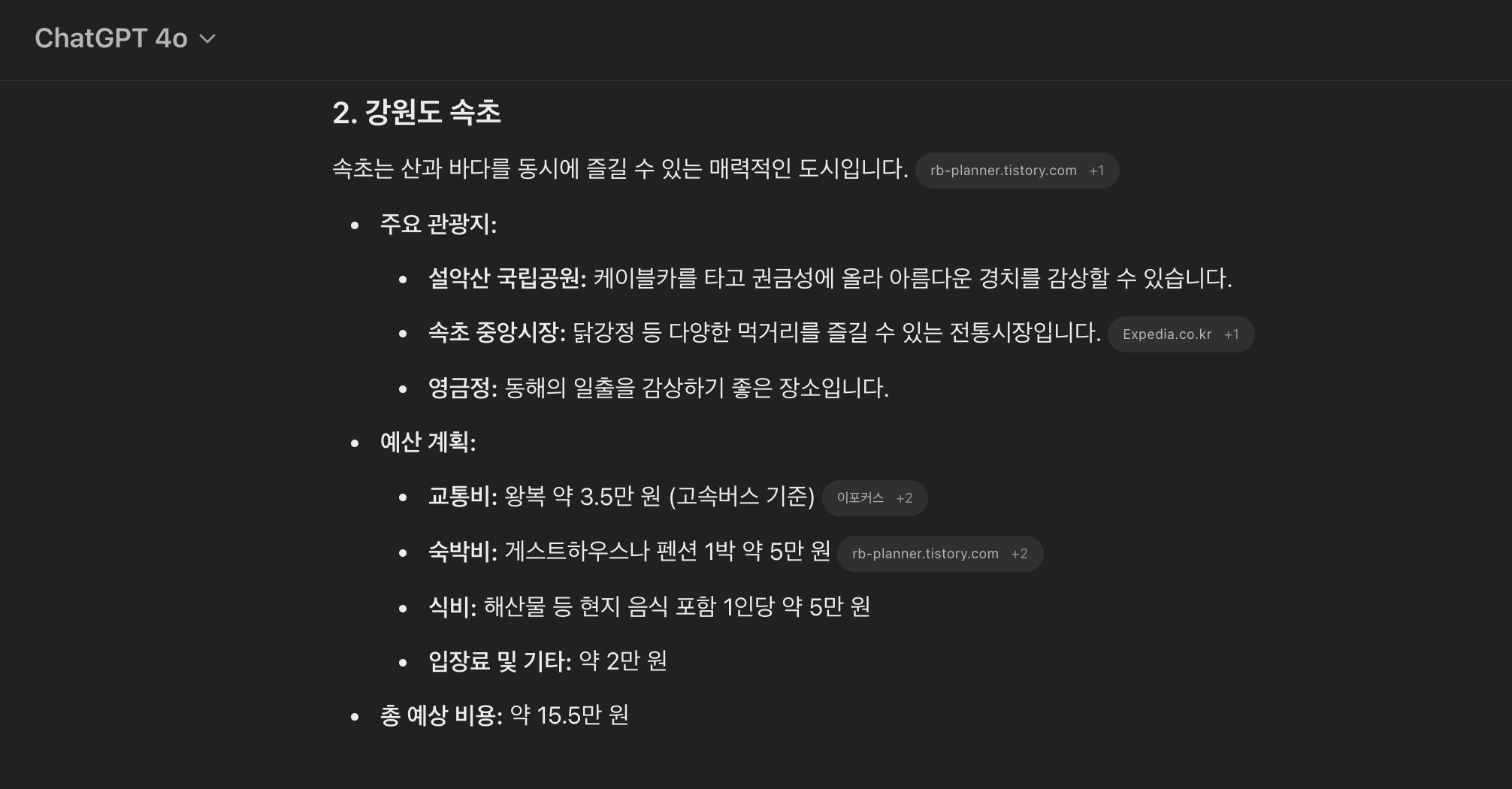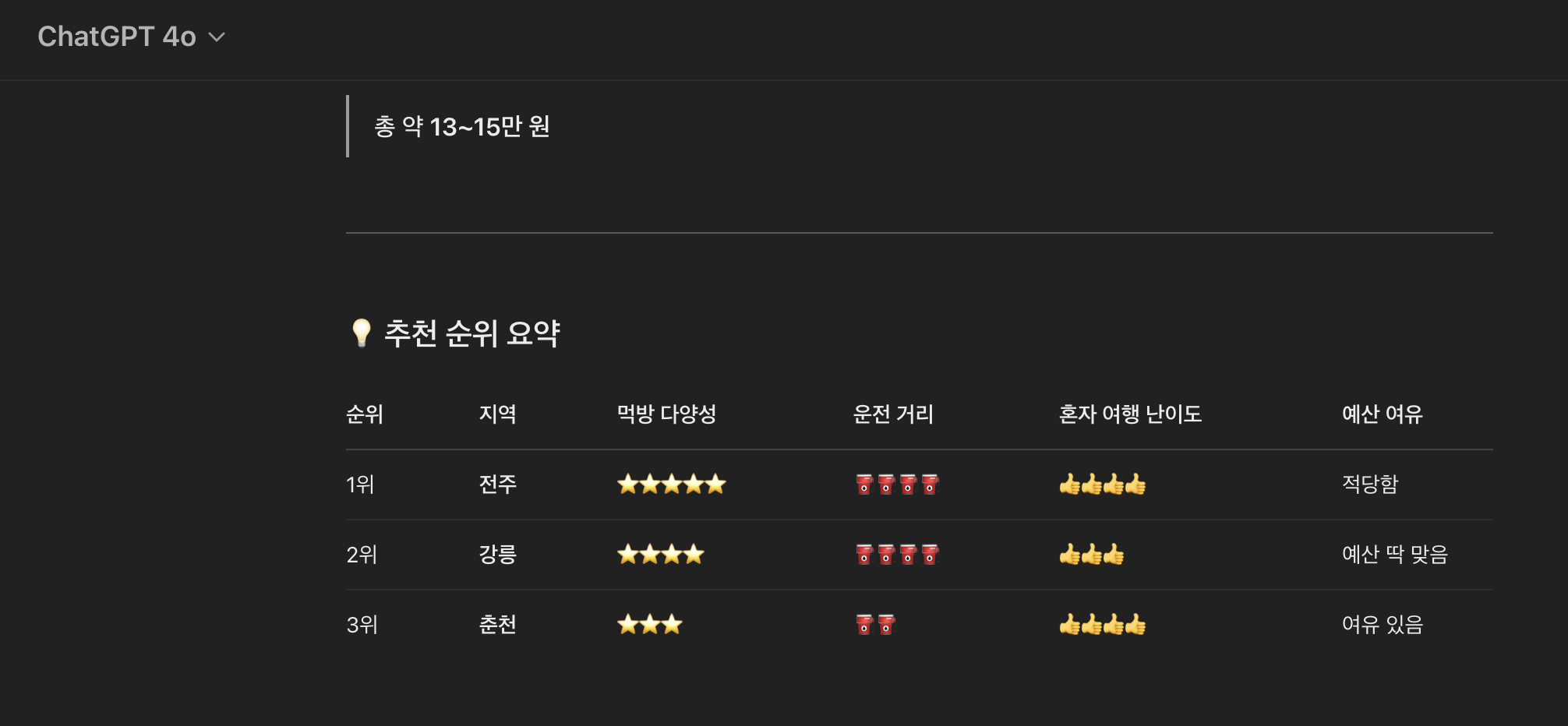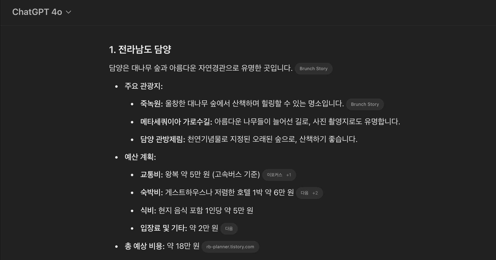 챗지피티는 담양, 전주, 속초 세 곳을 추천해주고 버스비와 숙소 식비 등을 간단하게 정리하여 계획을 짜주었다