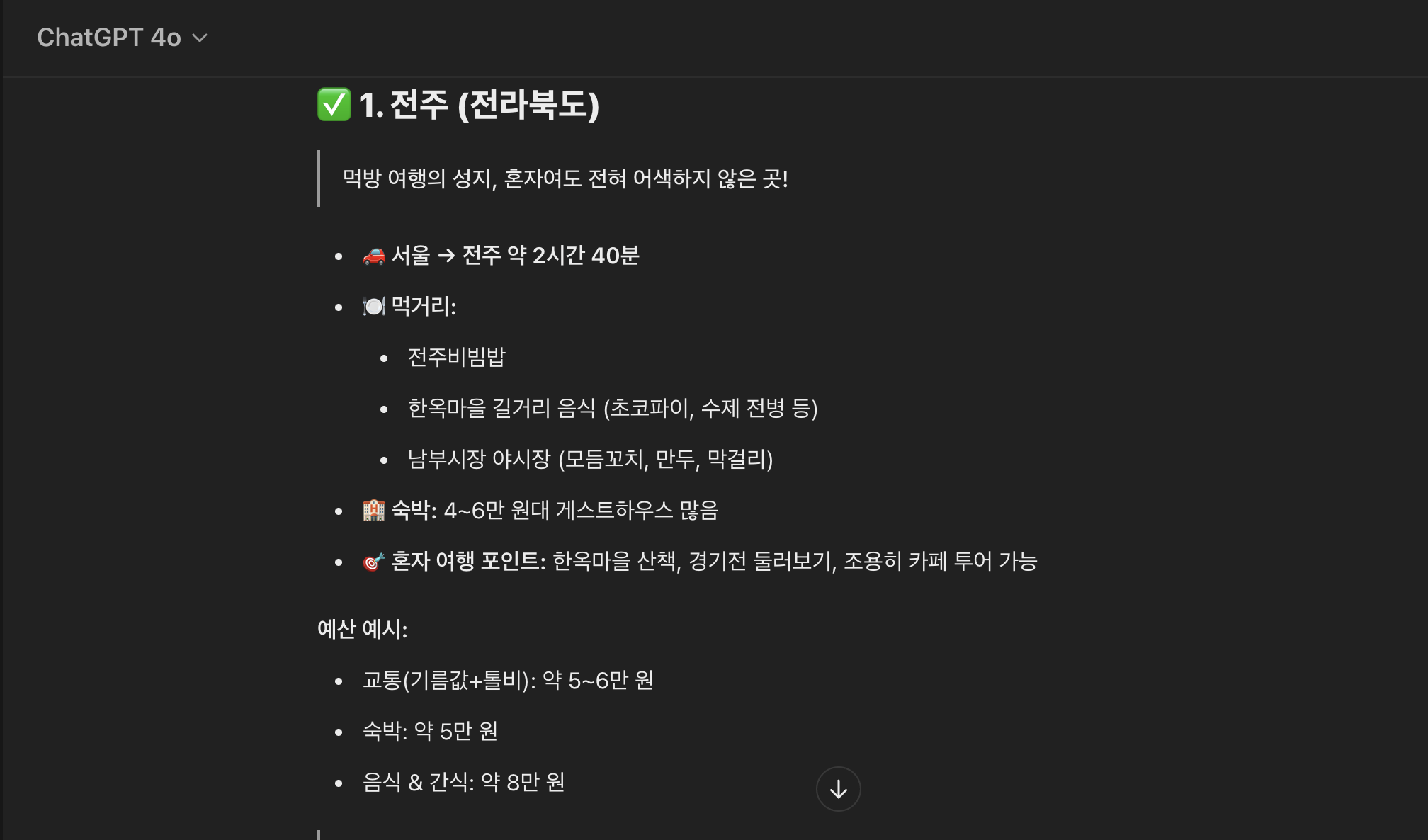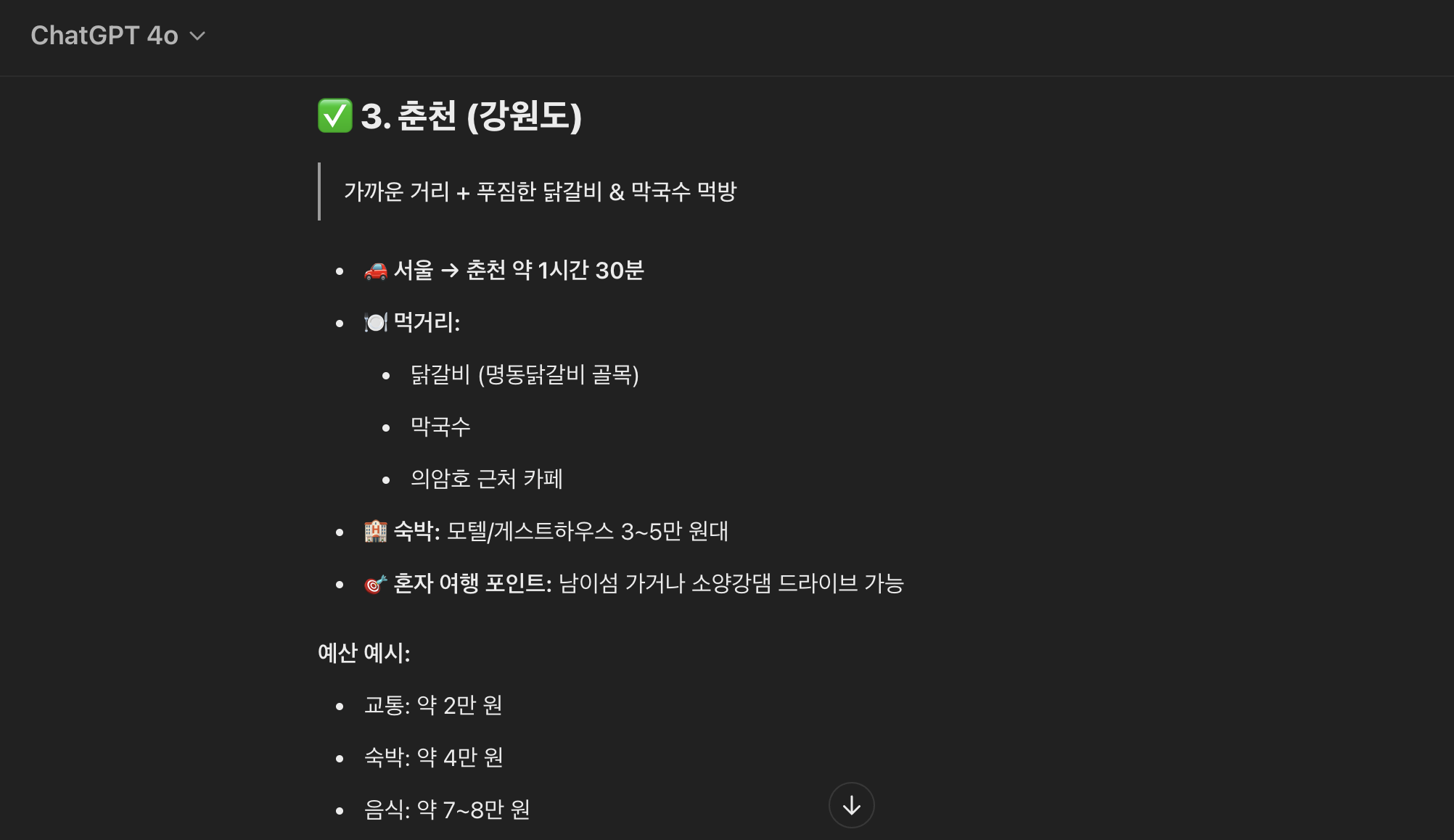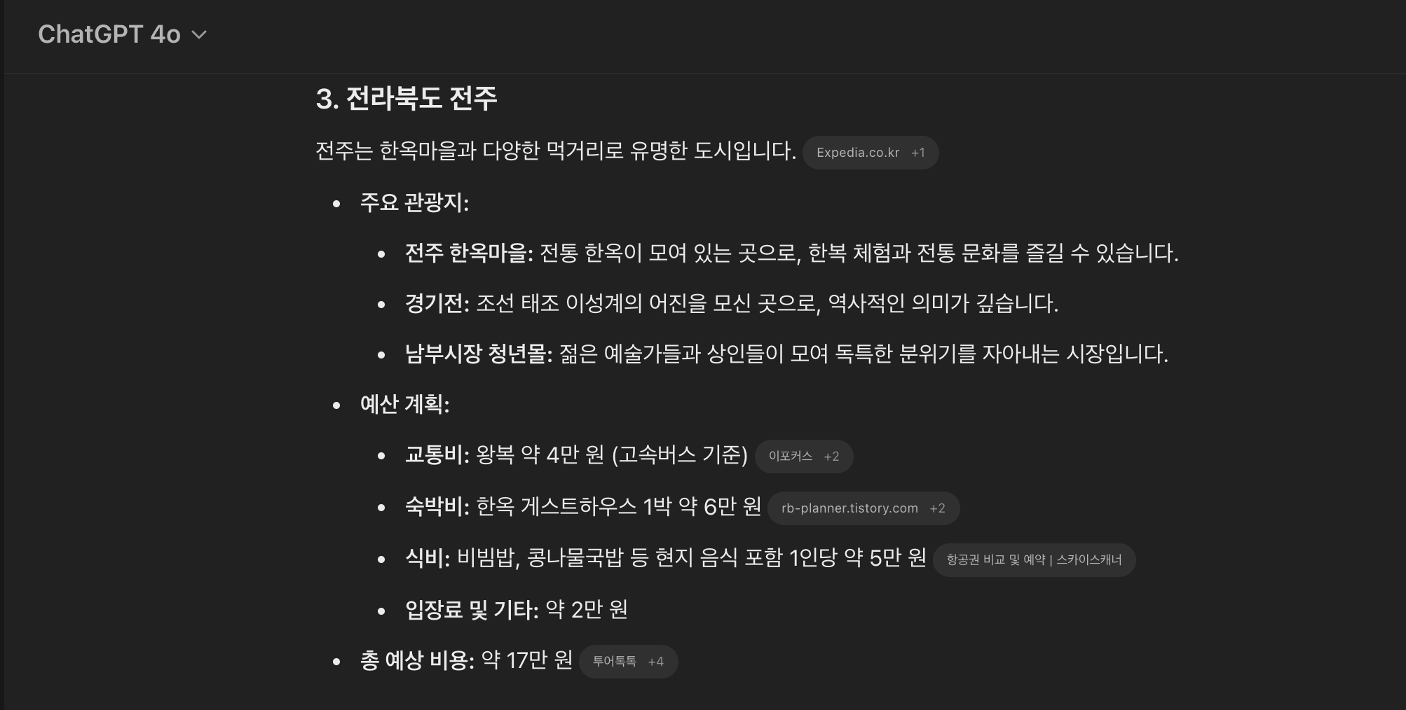 챗지피티는 담양, 전주, 속초 세 곳을 추천해주고 버스비와 숙소 식비 등을 간단하게 정리하여 계획을 짜주었다