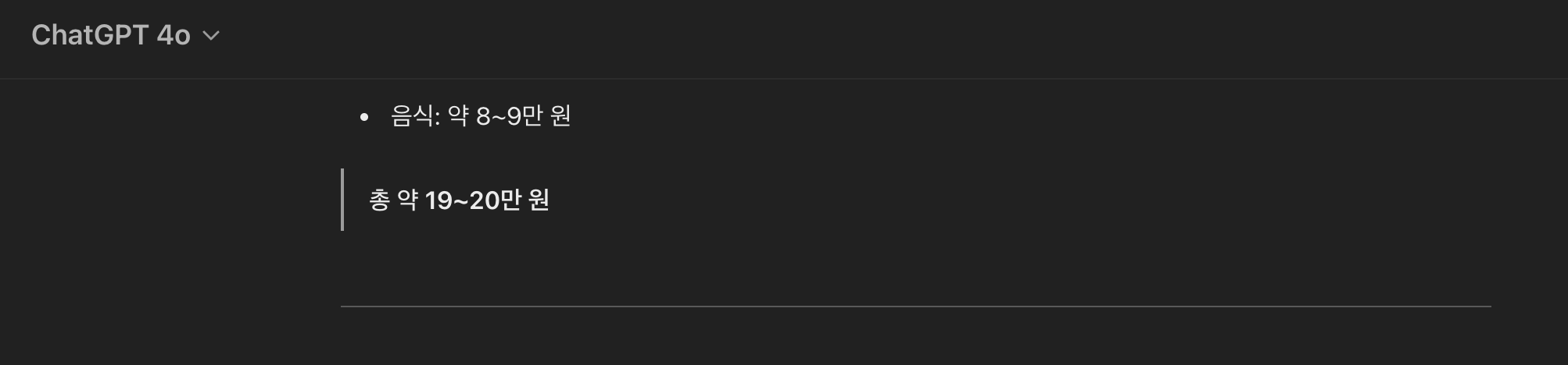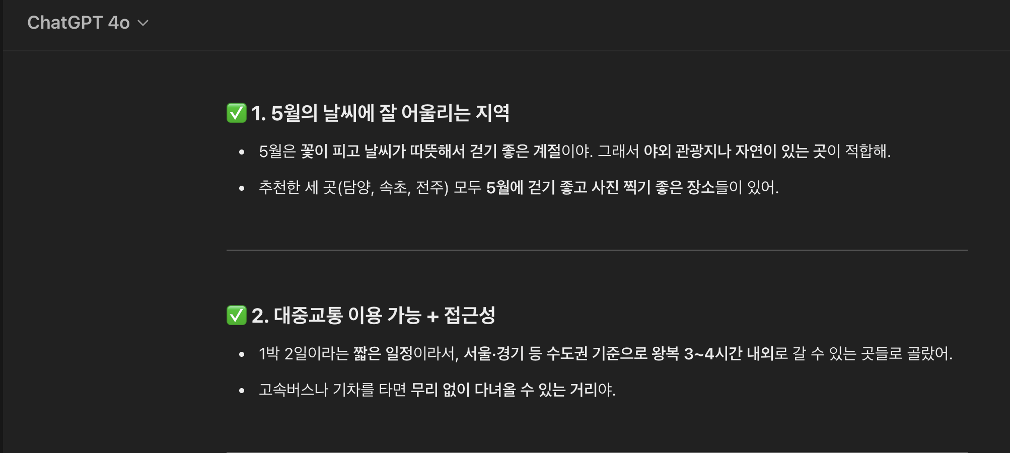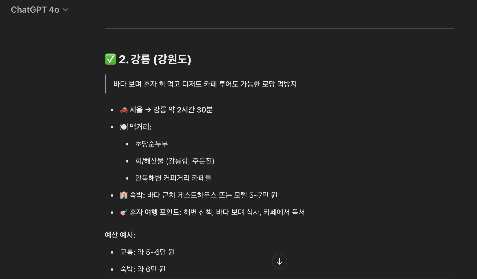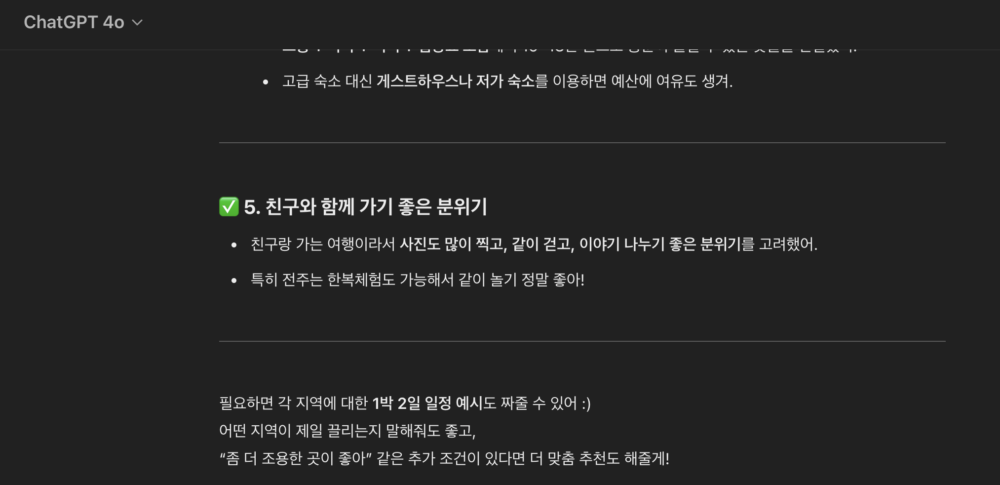 챗지피티는 담양, 전주, 속초 세 곳을 추천해주고 버스비와 숙소 식비 등을 간단하게 정리하여 계획을 짜주었다