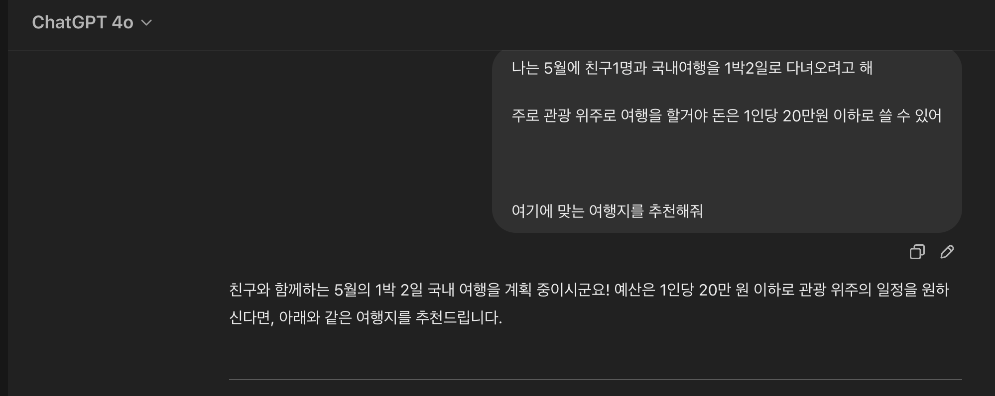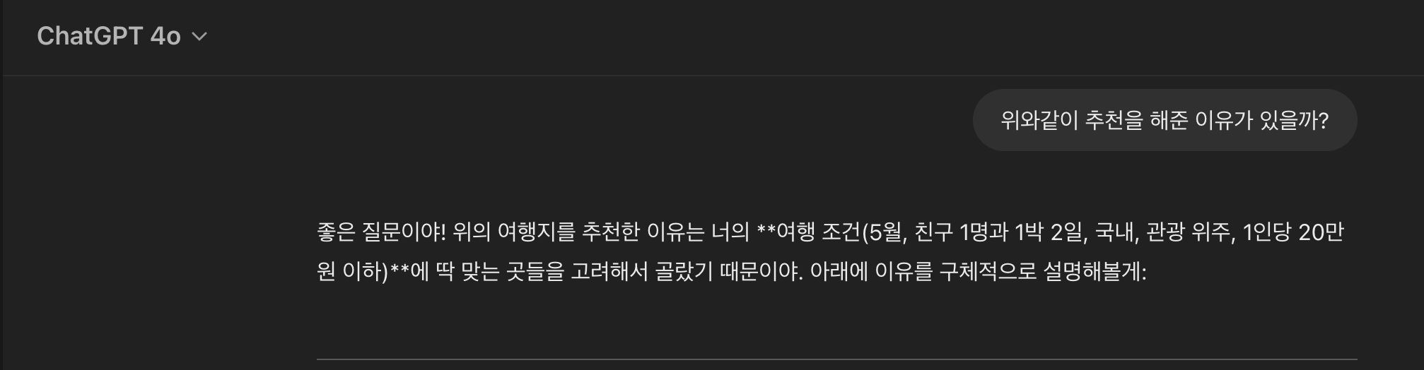 만약 다른 여행지를 추천받고싶다면 다른 곳을 추천해달라고 하면된다