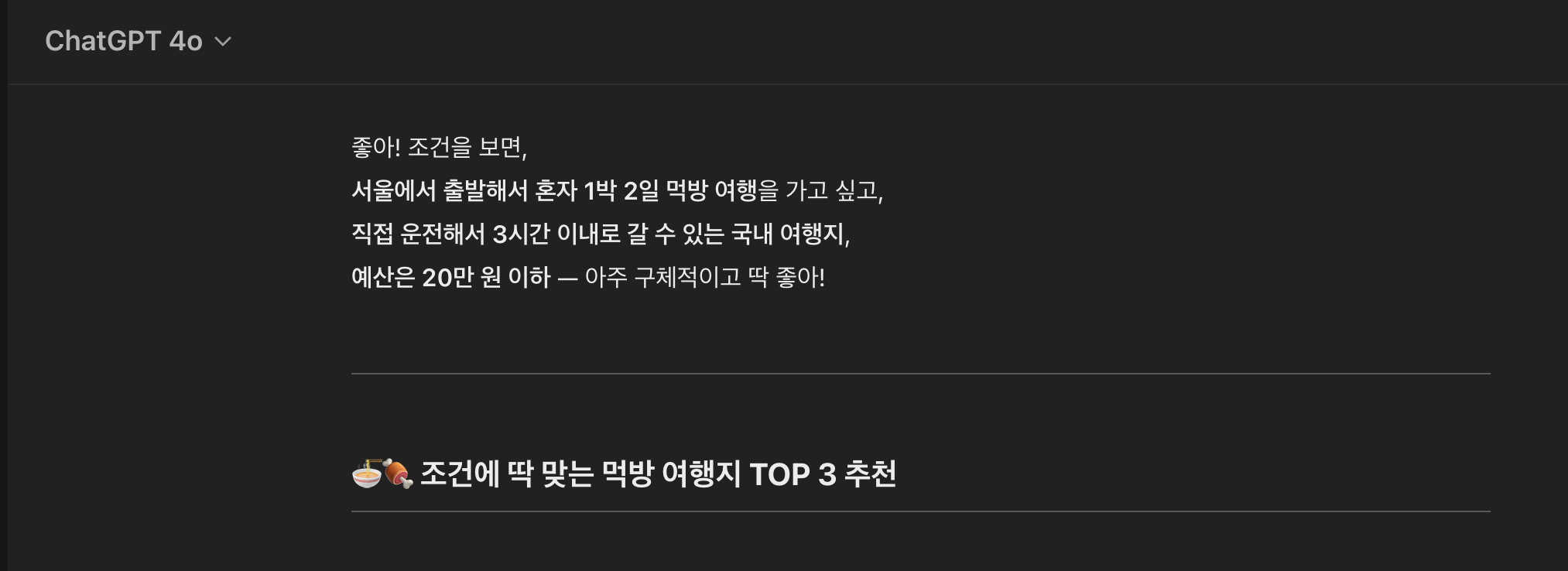 📌 상황2. 나는 국내여행을 1박2일동안 혼자 여행 갈 것이며, 직접 운전하여 이동할 것, 출발지는 서울, 운전은 약 3시간 이내로만 할 것, 예산은 20만원 이하, 먹방을 위주로 여행을 할 것